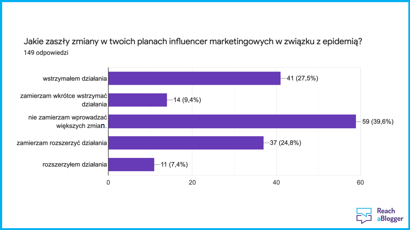 Reklamodawcy zostali zapytani m.in. o to jak zmieniają się ich bieżące plany influencer marketingowe w związku z epidemią. Aż 39,6% reklamodawców odpowiedziało, że nie zamierza wprowadzać większych zmian w swoim planie działania. Była to najczęściej wskazywana odpowiedź. Druga w kolejności najczęściej udzielana odpowiedź to „wstrzymałem działania” – tę opcję wskazało 27,5% ankietowanych. Natomiast 24,8% respondentów zamierza wkrótce rozszerzyć działania influencerskie, co traktować można jako bardzo dobrą wiadomość dla branży.