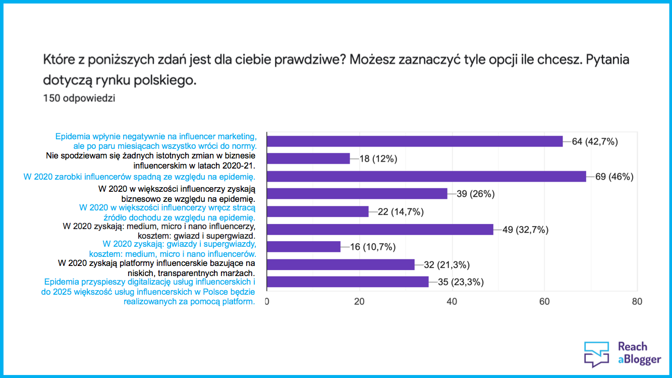Badanie zostało przeprowadzone przez platformę REACHaBLOGGER.pl w dniach 14-27 kwietnia 2020 r., wzięło w nim udział 150 reklamodawców aktywnych w obszarze influencer marketingu (marketerów i przedstawicieli agencji reklamowych).