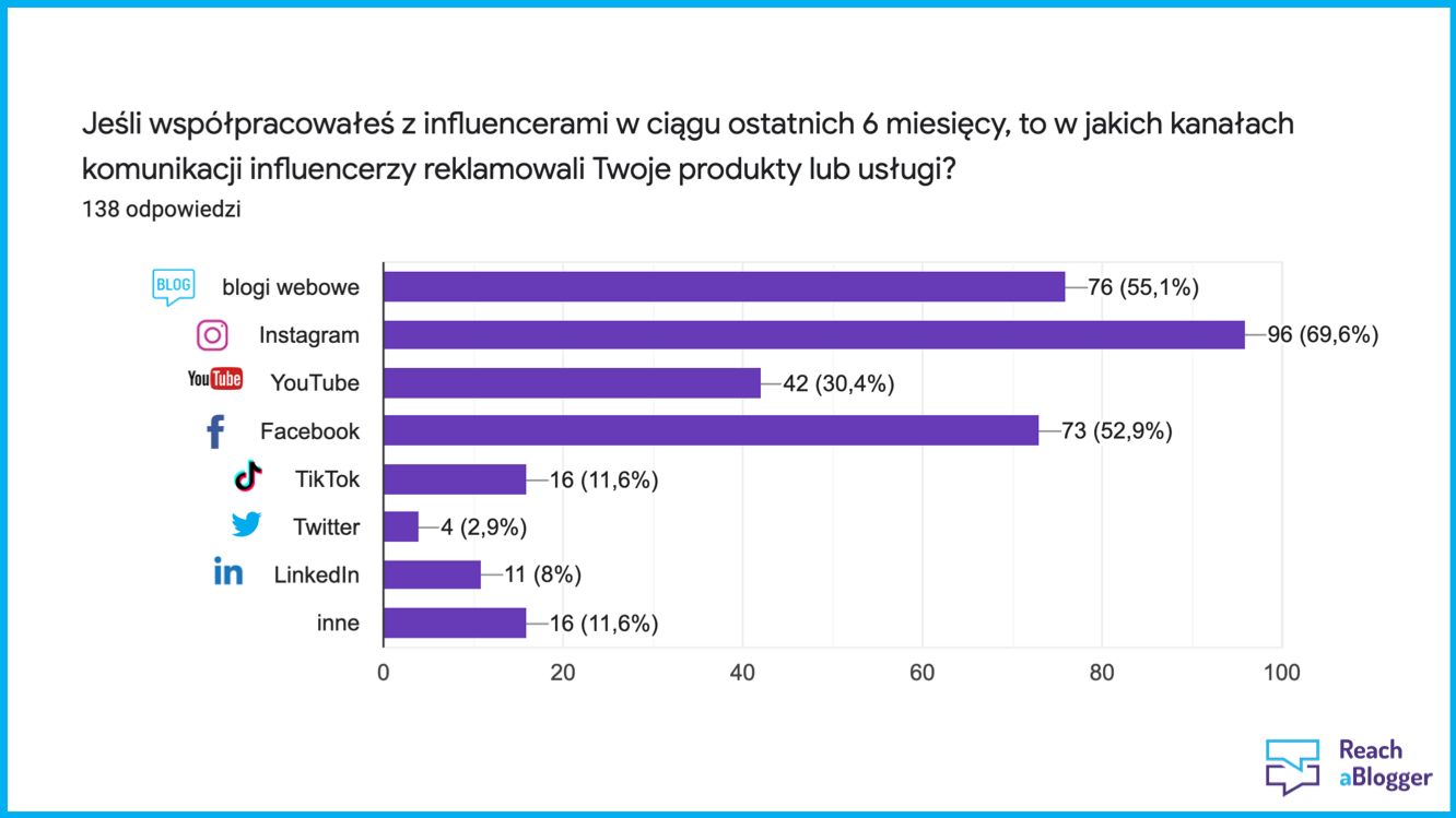 Zdecydowana większość uczestników badania, bo aż dwie trzecie ankietowanych, nawiązuje współpracę bezpośrednio, poszukując partnerów w Google lub social mediach, jedna trzecia poszukuje samodzielnie, za pomocą grup tematycznych na Facebooku. Platformy influencerskie są trzecim pod względem popularności kanałem współpracy z influencerami – otrzymały 31,5% wskazań w badaniu.