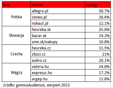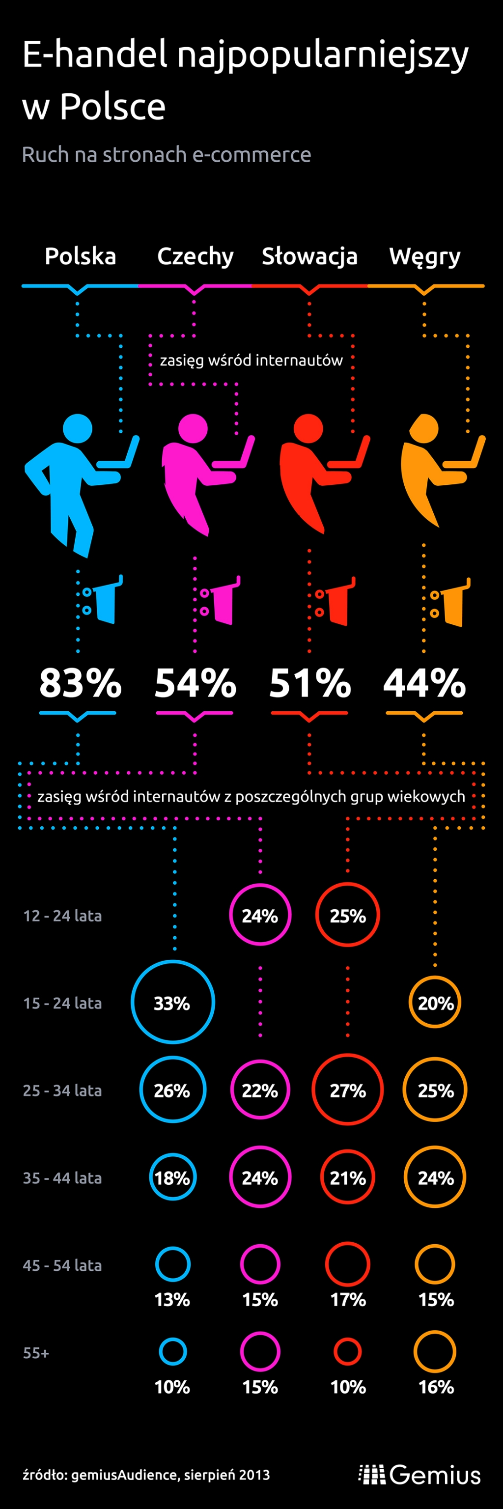 Gemius wziął pod lupę ruch na stronach związanych z e-commerce (tj. sklepy www, aukcje internetowe, porównywarki cenowe, serwisy z opiniami, zakupy grupowe czy pasaże handlowe) w Czechach, Polsce, na Słowacji i na Węgrzech. Przeanalizowano dane z sierpnia 2013 roku. Okazało się, że we wszystkich krajach cieszą się dużą popularnością. Najbardziej zainteresowani e-zakupami są Polacy. Ponad 80 proc. polskich użytkowników sieci weszło na strony związane z e-commerce. W Czechach 54 proc., na Słowacji 51 proc., a na Węgrzech 44 proc. internautów.