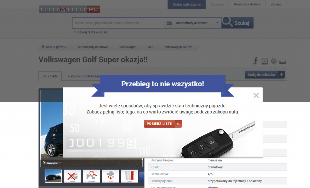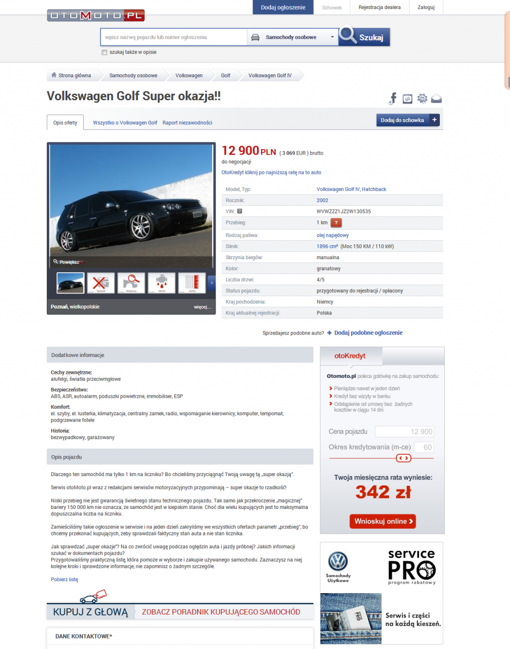 W bazie ogłoszeń pojawiła się też oferta sprzedaży samochodu (Volkswagen Golf – czyli najczęściej poszukiwany model), który na liczniku ma…1 kilometr. Na stronie tej „super okazji” zamieszczono informacje o akcji i link do poradnika dla kupujących.