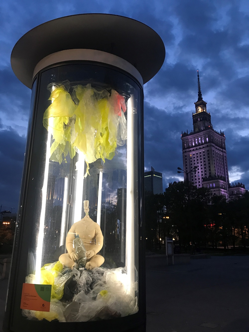 Szczególnie ciekawe działanie w ramach kampanii na nośnikach Warexpo, zaproponował Staromiejski Dom Kultury i działająca przy nim Galeria Promocyjna. Instytucja nadal zamknięta dla społeczności, w niekonwencjonalny sposób wykorzystała słupy reklamowe, tworząc z nich swego rodzaju gabloty wystawiennicze. Nośniki stały się przestrzenią ekspozycyjną w specyficznych okolicznościach opustoszałego miasta. Na Placu Defilad, w słupach reklamowych, stanęły rzeźby przedstawiające destrukcyjny wpływ człowieka na środowisko. Artystyczna aranżacja została stworzona z wykorzystaniem przedmiotów jednorazowego użytku − rękawiczek, plastikowych butelek, maseczek, folii. Wśród nich stoją rzeźby, których autorką jest artystka Ewa Dąbrowska.