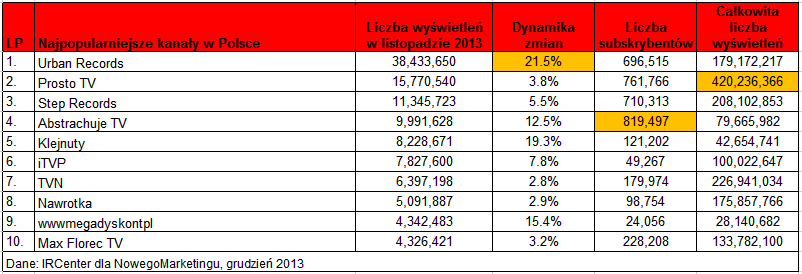 W listopadzie najwięcej wyświetleń zanotowano na kanałach Urban Records (ponad 38 mln), Prosto TV (ponad 15 mln), Step Records, Abstrachuje TV, Klejnuty, iTVP, TVN, Nawrotka, wwwmegadyskontpl i Max Florec TV.