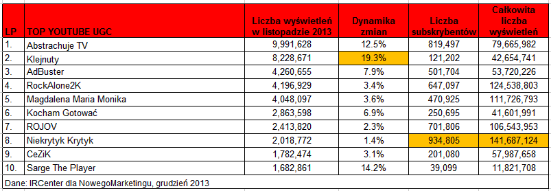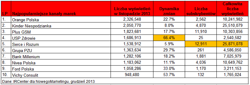 W listopadzie br. najchętniej oglądane były filmy opublikowane na kanałach marek Orange Polska, Kinder Niespodzianka, Plus GSM, USP Zdrowie, Serce i Rozum, Grupa PZU, Bank Millennium, Nivea Polska, Ford Polska i Vichy Consult.