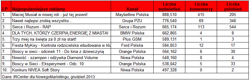 Wśród reklam opublikowanych przez marki najczęściej oglądane były spoty Maybelline Polska, Grupy PZU, Serce i Rozum, BMW Polska, Plus GSM, Ford Polska, Orange Polska i Nivea Polska.