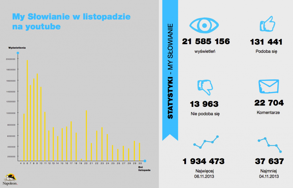 Największym przebojem YouTube w Polsce jest przebój Donatana i Cleo “My Słowianie”, który został wyświetlony ponad 21,5 mln razy na profilu UrbanRecTv – poniżej statystyki wg raportu Social Brand Footprint tworzonego przez NapoleonCat.com. Teledysk ten znalazł się także na drugim miejscu na liście najczęściej oglądanych utwórów muzycznych na terenie Polski w 2013 roku.