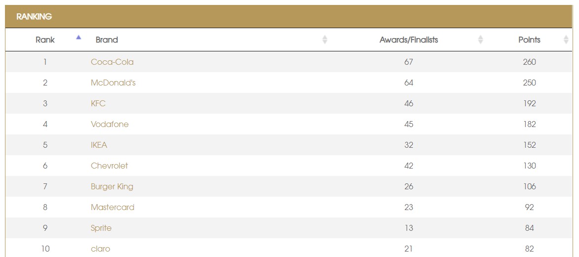 Na pierwszym miejscu znalazła się marka Coca-Cola. Drugie zaś miejsce należy do sieci McDonald’s, a trzecie – do KFC.