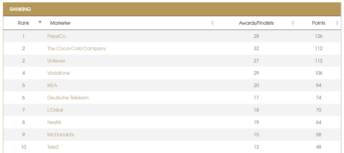 W Europie najefektywniejszym marketerem według Effie Index jest PepsiCo. Na drugim miejscu ex aequo znalazły się firmy Coca-Cola oraz Unilever, a na czwartym – Vodafone.