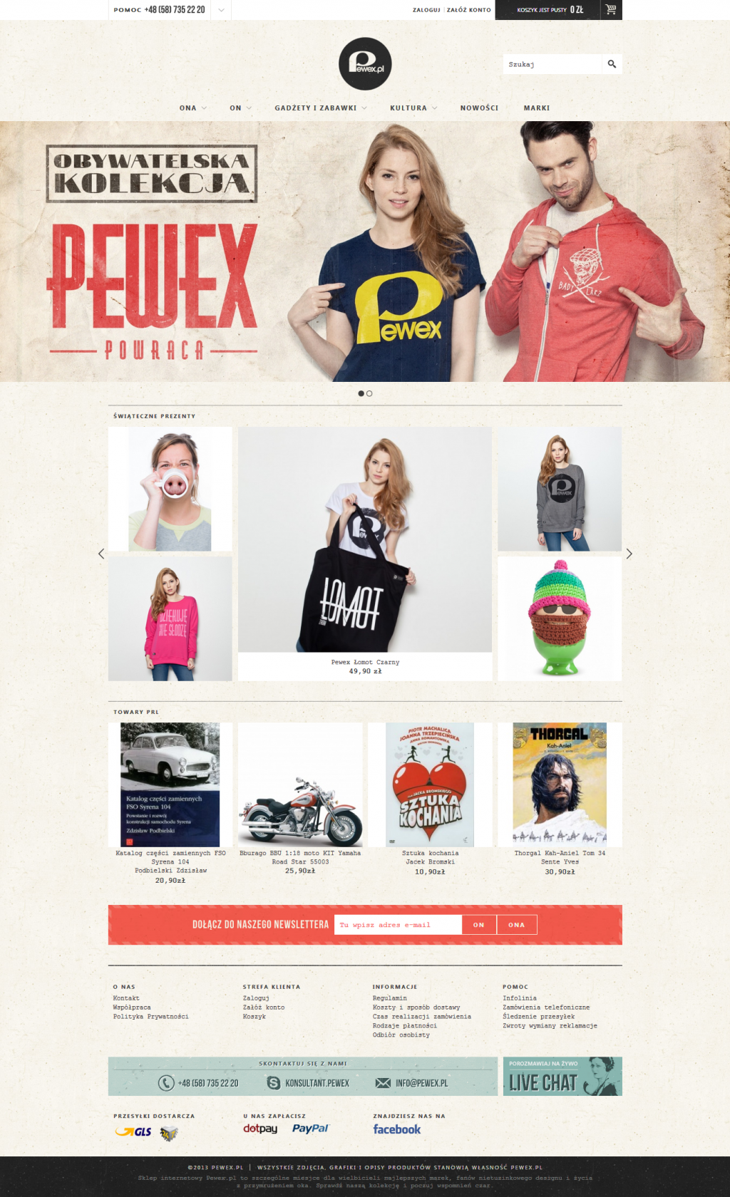 Pewex.pl oferuje zarówno produkty znanych, światowych marek jak i własne. Wśród tych ostatnich są koszulki, bluzy i dodatki. Wszystkie produkty sygnowane przez Pewex.pl zostały wyprodukowane w UE (w Polsce, Niemczech i Wielkiej Brytanii). Linia odzieży projektowanej i produkowanej dla Peweksu będzie stale powiększana.