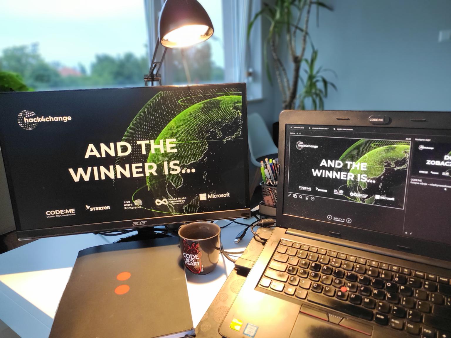 Podczas Hack4Change powstało wiele niesamowitych projektów, jednak największe uznanie jury zyskał zespół Świetliki, czyli – Jakub Duda, Piotr Woźniak i Katarzyna Kulik – i ich Aplikacja do Świecenia Przykładem. Zwycięski projekt wykorzystując grywalizację pomaga użytkownikom wyrabiać „zielone nawyki”. Aplikacja ma pomagać w segregacji odpadów, zwiększać świadomość dotyczącą składu produktów i promować zielony transport. W ramach nagrody członkowie zespołu wybiorą się do siedziby Microsoft, gdzie będą mieli okazję skonsultować dalsze kroki w rozwoju swój projektu ze specjalistami. Zwycięzcy otrzymają także vouchery na kursy programowania w CODE:ME oraz ciekawe nagrody rzeczowe – głośniki, plecaki, koszulki, power banki oraz książki Marka Kamińskiego i zaproszenie na kawę z ich autorem.
