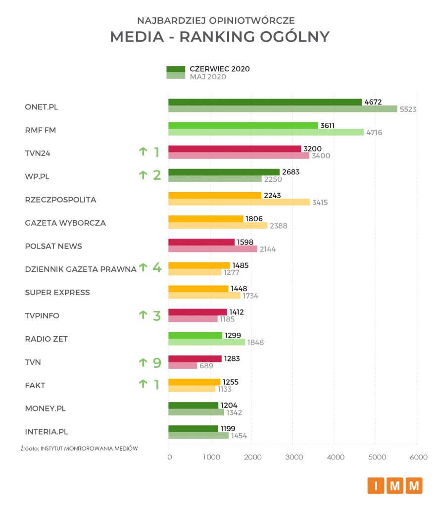 Podium rankingu ogólnego, z wynikiem ponad 4,6 tys. cytowań do 5,5 tys. w maju, otwiera Onet.pl – niekwestionowany lider od ponad roku, a za nim w czołówce RMF FM oraz TVN24. Miejsce czwarte zajmuje zaś Wp.pl ze wzrostem o dwie pozycje względem poprzedniego miesiąca (2,6 tys. cytatów w innych mediach w czerwcu kontra 2,2 tys. w maju br.). Aż o cztery pozycje natomiast wzrosła pozycja Dziennika Gazety Prawnej głównie za sprawą regularnych doniesień dotyczących koronawirusa oraz relacjonowania ostatnich dni kampanii prezydenckiej w kontekście wizyty Andrzeja Dudy w USA, oraz obecności Rafała Trzaskowskiego w Warszawie w okresie powodzi. O trzy pozycje, ostatecznie plasując się na dziesiątym miejscu, wzrosła cytowalność programu TVP Info w związku m.in. z wypowiedzią posła Prawa i Sprawiedliwości, Przemysława Czarnka, dotyczącą osób LGBTQ+. Częściej niż zwykle media powoływały się również na stację TVN, która na bieżąco informowała o wynikach wyborów prezydenckich.