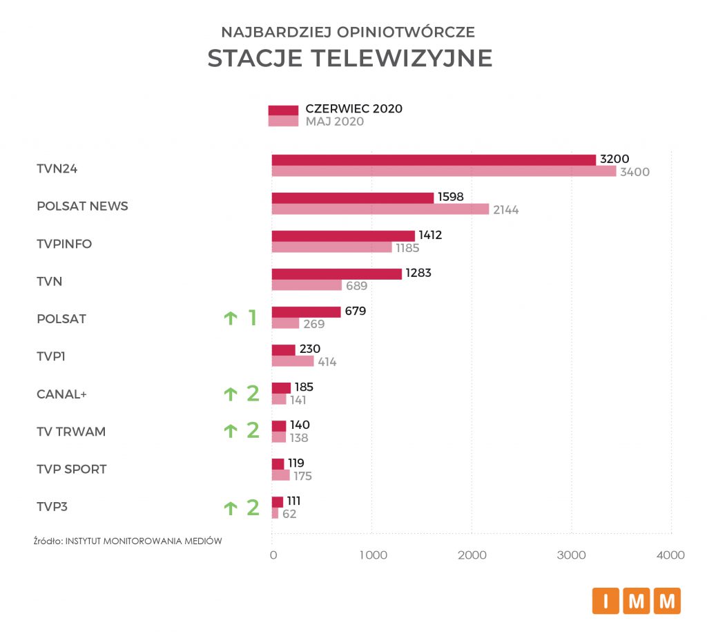 Tytuł najbardziej opiniotwórczego medium w kategorii stacji telewizyjnych w czerwcu zajmuje stacja TVN24, która cytowana była 3,2 tys. razy. Podobnie jak w maju, kolejne miejsca zajęły odpowiednio Polsat News (prawie 1,6 tys. wzmianek) oraz TVP Info (1,4 tys.). O dwie pozycje w rankingu wzrosły również stacje Canal+, Telewizja Trwam oraz TVP 3.