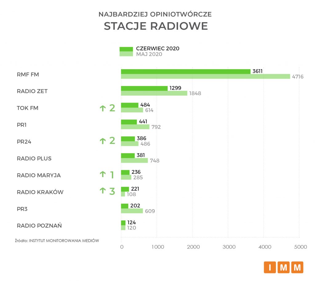 W czerwcu najchętniej powoływano się na radio RMF FM, które cytowane było 3,6 tys. razy. Miejsce drugie w tej kategorii zajęło Radio Zet, natomiast na miejscu trzecim ze wzrostem o dwie pozycje, uplasowała się stacja TOK FM, między innymi dzięki wywiadowi, jakiego udzielił redakcji polityk Konfederacji, Jacek Wilk. O dwie pozycje w rankingu wzrosła również pozycja Programu 24, w którym na pytania dotyczące m.in. relokacji uchodźców odpowiadał wiceszef klubu PiS, Marek Suski. Natomiast aż o trzy pozycje w stosunku do maja br. wzrosła pozycja Radia Kraków, w którym emitowana była rozmowa z wicemarszałkiem Sejmu, Ryszardem Terleckim.