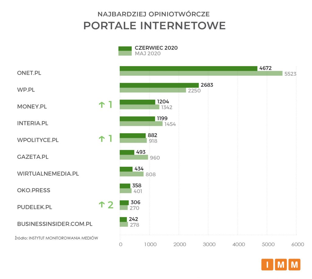 W zestawieniu najczęściej cytowanych portali internetowych pierwsze miejsce zajął niezmiennie Onet.pl z wynikiem ponad 4,6 tys. cytowań. Na miejscu drugim podobnie jak w maju br. znalazł się portal Wp.pl, natomiast miejsce trzecie z wynikiem 1,2 tys. wzmianek i wzrostem o jedną pozycję w rankingu, zajmuje Money.pl. Ponadto o dwie pozycje wzrosła pozycja portalu Pudelek.pl, na który w czerwcu powoływano się 306 razy, za sprawą informacji o porodzie Małgorzaty Rozenek – Majdan oraz spekulacji dotyczących związku Julii Wieniawy i Macieja Musiała.