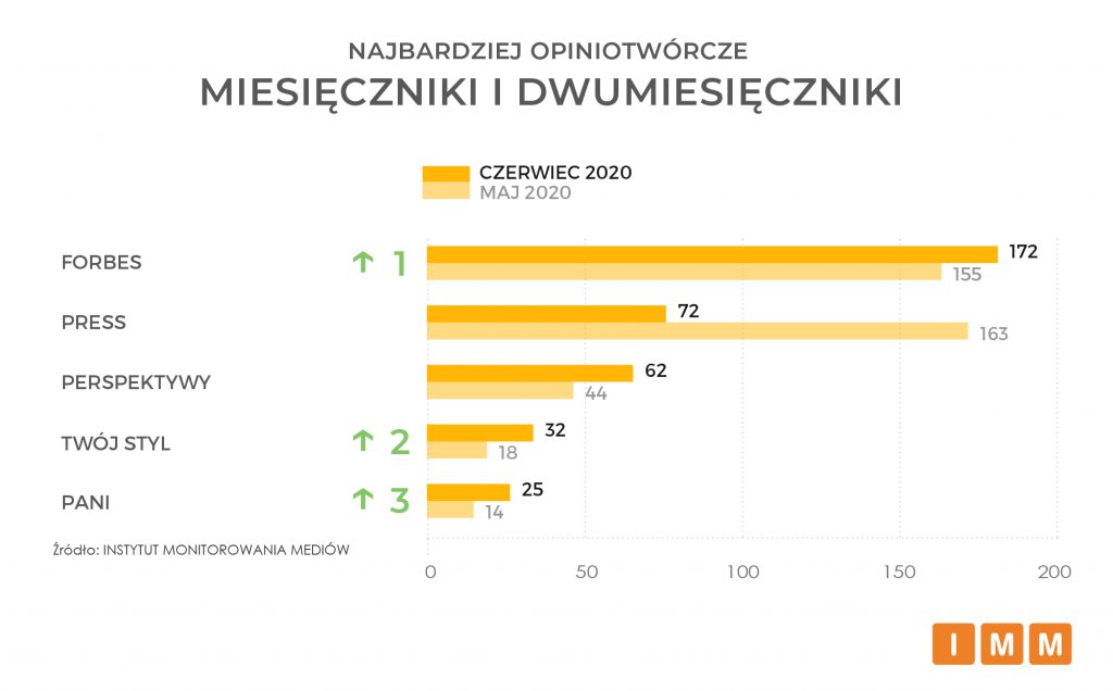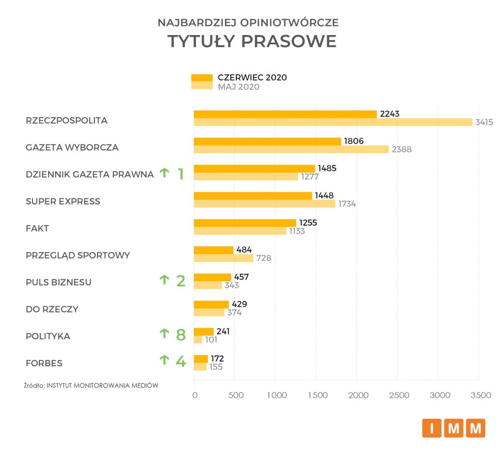 Najbardziej opiniotwórczy tytuł prasowy w Polsce w czerwcu 2020 to Rzeczpospolita wzmiankowana ponad 2,2 tys. razy. Miejsce drugie na podium w tej kategorii zajęła Gazeta Wyborcza (1,8 tys. cytowań), natomiast na trzeciej pozycji uplasował się Dziennik Gazeta Prawna z ponad 1,4 tys. cytowaniami. Aż o osiem miejsc wzrosła zaś pozycja tytułu Polityka (ponad 240 cytowań), między innymi za sprawą wypowiedzi Kuby Wojewódzkiego dotyczącej nowego partnera Anny Muchy oraz powoływania się na sondaż IBRIS dotyczący wyborów prezydenckich przeprowadzony dla tygodnika. O cztery pozycje wyżej, na miejscu dziesiątym w kategorii znalazł się natomiast miesięcznik Forbes m.in. dzięki publikacji rankingu najlepiej zarabiających piłkarzy. Media częściej cytowały również Puls Biznesu, głównie dzięki publikacjom dotyczącym „pakietu mieszkaniowego”, czy inwestycji firmy Google w Polsce.