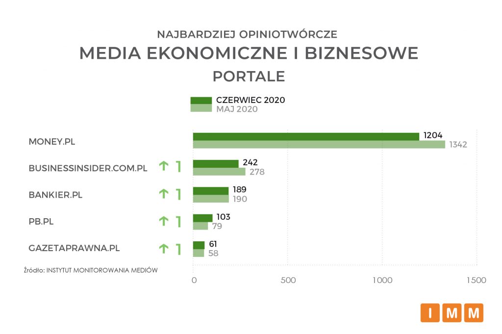 W rankingu mediów o profilu biznesowym i ekonomicznym obejmującym portale internetowe pierwsze miejsce w czerwcu zajmuje portal Money.pl z liczbą 1,2 tys. cytowań. Kolejną pozycję na podium plasuje portal businessinsider.com.pl (ponad 240 cytatów), natomiast pierwszą trójkę zamyka Bankier.pl, wzmiankowany prawie 190 razy.