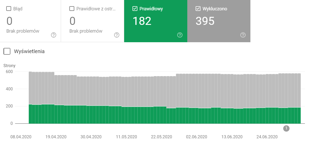 Kolejnym obowiązkowym narzędziem do analizy portalu jest Google Search Console. Ta platforma jest pośrednikiem pomiędzy wyszukiwarką Google’a a właścicielami serwisów. Dostarcza nam ona wielu bardzo istotnych informacji. W tym przypadku niezastąpiony jest raport o stanie indeksacji naszej witryny (Indeks > Stan):