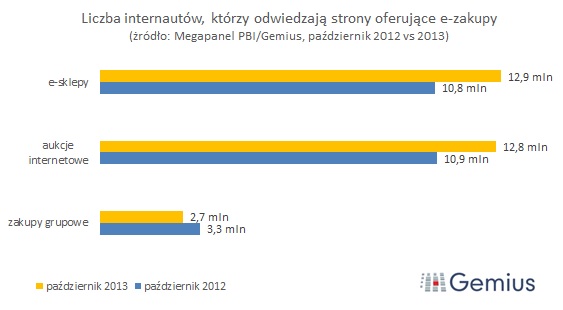 Gemius przeanalizował ruch na stronach e-sklepów, aukcji internetowych i zakupów grupowych. Jak pokazują najnowsze, październikowe wyniki badania Megapanel PBI/Gemius, 12,9 mln polskich internautów wchodzi na strony sklepów internetowych. Podobnym zainteresowaniem cieszą się strony aukcji internetowych (12,8 mln internautów). W obu przypadkach odnotowano wzrost o prawie jedną piątą użytkowników sieci w porównaniu do zeszłego roku. Natomiast najrzadziej internauci odwiedzają strony poświęcone zakupom grupowym. W analizowanym miesiącu weszło na nie 2,7 mln internautów, co daje wynik o ponad jedną piątą niższy do tego z października 2012 roku.