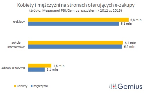 Zakupy w sieci są równie popularne wśród Polaków, jak i Polek. Wśród mężczyzn największą popularnością cieszą się aukcje internetowe. Odwiedza je 6,4 mln internautów płci męskiej. Natomiast wśród pań najpopularniejsze są e-sklepy (6,8 mln). Z kolei zakupy grupowe cieszą się większym zainteresowaniem kobiet (1,6 mln).