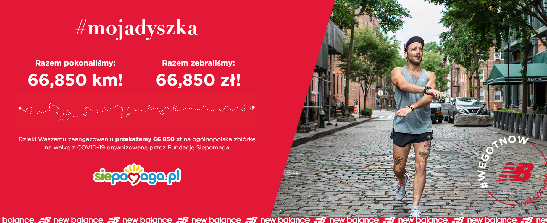 Kolejny gigant e-commerce, firma New Balance, przygotowała wspólnie z Siepomaga akcję #Mojadyszka, w ramach której marka przekazywała fundacji 10 zł za każde przebiegnięte 10 km przez użytkowników. Po pokonaniu określonego dystansu wystarczyło zrobić zdjęcie aplikacji typu Strava lub Endomondo z zarejestrowanym treningiem i wysłać ją na stronie Moja Dyszka. Zebrane środki zostały przeznaczone na walkę z koronawirusem.