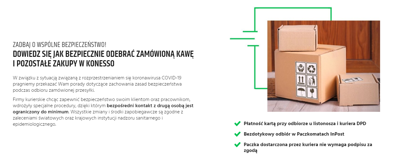 Prowadząc e-commerce, warto też poinformować odbiorców o tym, że przygotowując paczki do wysyłki, przestrzega się wszelkich zasad bezpieczeństwa i higieny. Poniżej przykład tego, jak firma Konesso informuje swoich klientów o bezpiecznych formach dostawy.