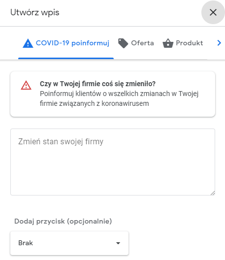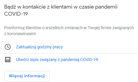 Możesz z tego miejsca utworzyć nowy wpis, który dotyczy aktualnych godzin pracy lub zmian wprowadzonych w firmie ze względu na epidemię. Wpis będzie wyświetlał się po prawej stronie w wyszukiwarce.