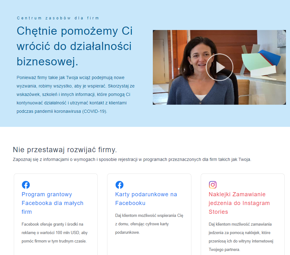 Naprzeciw firmom wyszedł także Facebook, który przygotował specjalną podstronę – Centrum zasobów dla firm: uodpornij firmę na zagrożenia. Serwis uruchomił program grantowy dla małych firm dotkniętych COVID-19, w ramach którego nawet 30 tys. mikroprzedsiębiorstw w ponad 30 krajach będzie mogło otrzymać grant od Facebooka.