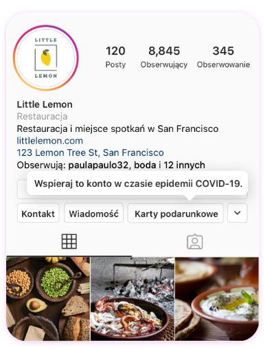 Instagram umożliwił przedsiębiorstwom dodanie do profilu cyfrowej karty podarunkowej, aby użytkownicy mogli wspierać lokalne firmy, kupując bony, które zostaną wykorzystane w dowolnym terminie. Dodatkowo udostępniono interaktywne naklejki, za pomocą których możesz poinformować w InstaStories swoich obserwujących o możliwości zakupienia kart podarunkowych. Gastronomia może skorzystać także ze specjalnego buttonu z usługą zamawiania jedzenia, po dokonaniu konfiguracji u partnera dostawcy (na terenie Polski lokale gastronomiczne mogą rozpocząć współpracę z UberEats, a karty podarunkowe obsługuje GiftUp! lub SumUp!). Więcej o konfiguracji cyfrowych kart podarunkowych znajdziesz tutaj.