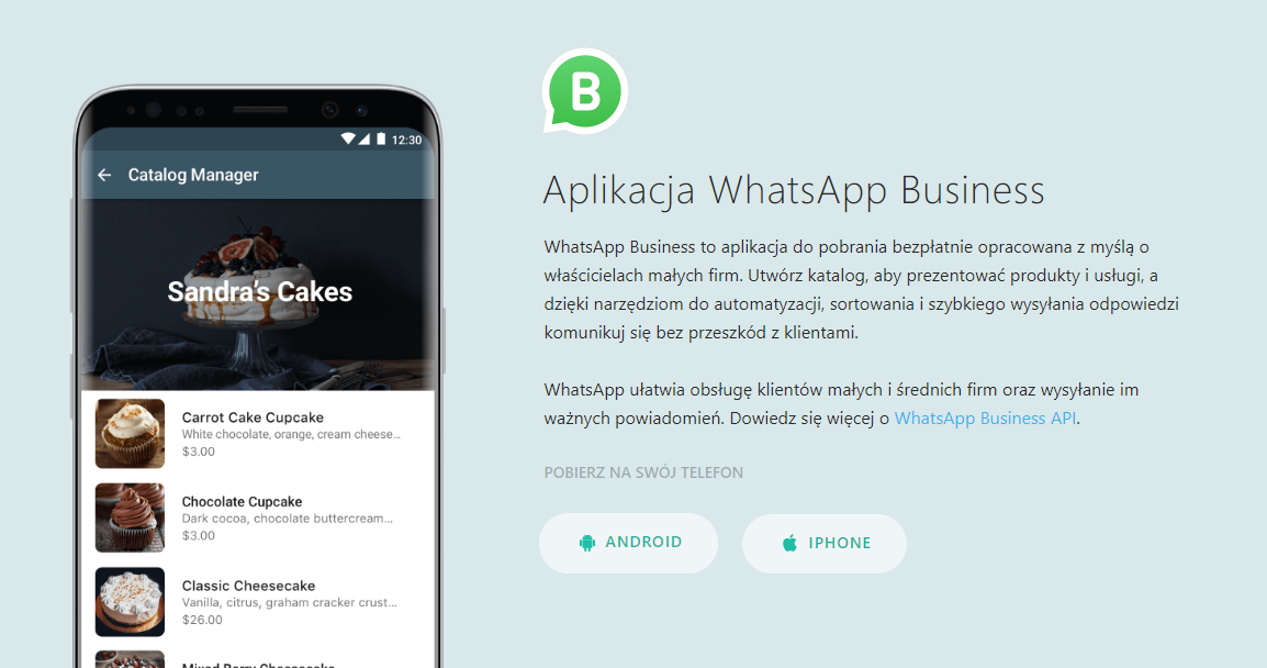 Aby ułatwić klientom kontakt z twoją firmą, możesz założyć bezpłatne konto WhatsApp Biznes. Aplikacja dostępna jest na Android i iOS i umożliwia zaprezentowanie i udostępnianie produktów oraz usług na twoim koncie. Jest to także doskonałe narzędzie do komunikacji, zwłaszcza dla osób, które np. nie korzystają z Facebooka, a chcą z tobą się szybko skontaktować. WhatsApp Biznes pozwala także na tworzenie automatycznych odpowiedzi powitalnych oraz ustawienie wysyłki wiadomości informujących o godzinach pracy (więcej informacji tutaj).
