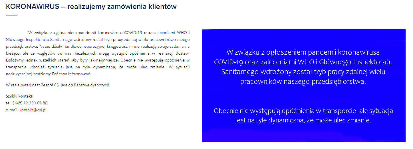 Wiele sklepów e-commerce informuje także swoich klientów o ewentualnych opóźnieniach w dostawie oraz o pracy w okrojonym składzie. Warto udzielić informacji, aby konsumenci wiedzieli, czego mają się spodziewać. Możemy o tym napisać na naszym blogu, w dziale aktualności, czy też tworząc specjalną podstronę, np. taką jak sklep CSI.