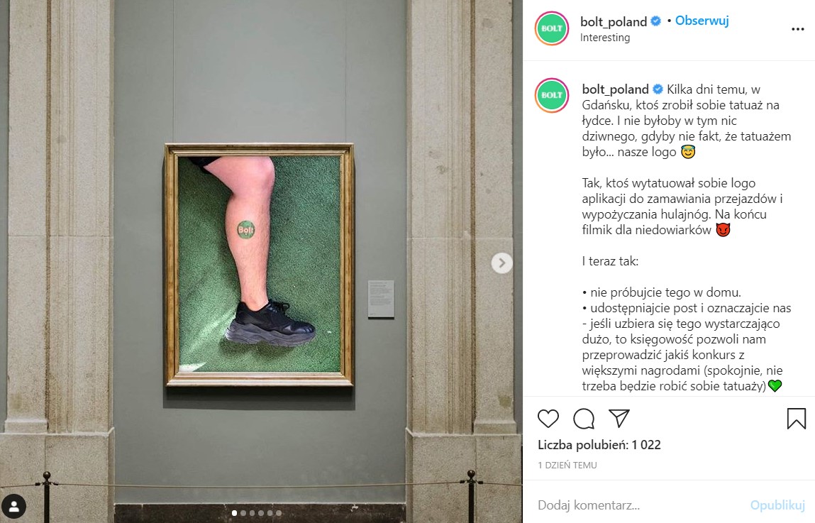 Skąd taki pomysł? Otóż, twórcy platformy zainspirowali się działaniem pewnego użytkownika, który postanowił wytatuować sobie na łydce logotyp Bolta. Liczył tym samym na bezpłatne przejazdy. Jak mówią przedstawiciele Bolta, jego plan się powiódł ;).