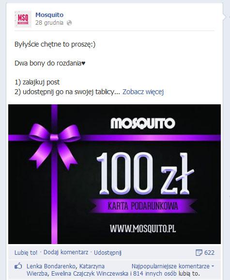 Mniejsze marki, podobnie jak liderzy rynku, prezentują na swoich profilach nowe kolekcje, wybrane modele i zestawienia na konkretną okazję. Na ich fanpage’ach można znaleźć również inne rozwiązania, jednym z nich są tzw. „rozdania”. Jest to forma konkursowa polegająca na obligatoryjnym polubieniu profilu, udostępnieniu postu konkursowego oraz skomentowaniu go. Sposób ten doskonale sprawdza się jako narzędzie budowania zasięgu, a posty konkursowe dorównują w ilości udostępnień tym publikowanym przez największe domy mody. Część zasięgu jest z pewnością pusta, ale patrząc na przykład marki Mosquito, która w zamian za tak prowadzoną komunikację konkursową oferuje dwa bony na bagatela 100 zł i zyskuje 622 udostępnienia oraz 817 „lajków”, zastanowić się warto czy gra jest warta świeczki. Co dają takie działania? Wpływają na rozpoznawalność marki, zbierają nową publiczność, co w efekcie przełożyć się może na podjęcie decyzji zakupowej.