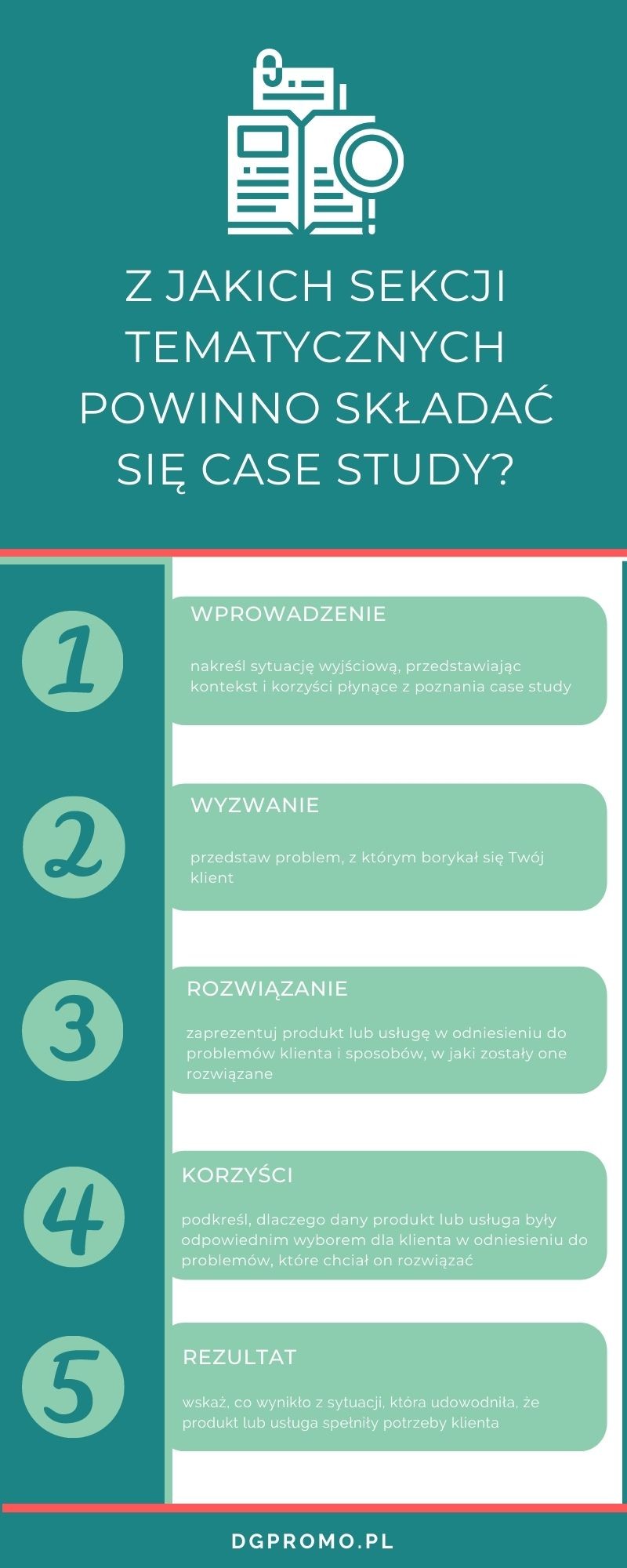 Podczas tworzenia studium przypadku bardzo ważne jest odpowiednie poukładanie wiadomości. Wówczas wzmocnimy siłę przekazu i sprawimy, że użytkownik będzie zaciekawiony opowiadaną przez nas historią. Z jakich sekcji powinno składać się case study? Kluczowe informacje znajdziesz na infografice: