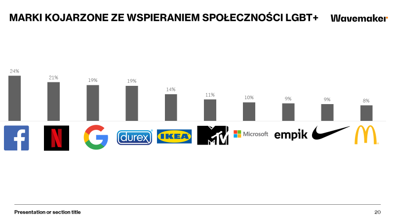 Wavemaker w badaniu aktywizmu marek nieco głębiej przyjrzał się kwestii okazywania wsparcia społeczności LGBT+. Sam gest zmiany logotypu na tęczowy (część firm obchodzi w ten sposób Miesiąc Dumy LGBT+) docenia niespełna 38%. badanych, przy zbliżonym odsetku obojętnych i 26% kontestujących taką zmianę.