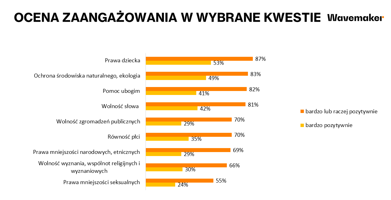 Cztery spośród badanych tematów: obrona praw dzieci, ochrona środowiska, pomoc ubogim i wolność słowa, okazują się najbliższe polskim konsumentom. Co ciekawe – we wszystkich analizowanych kwestiach, od równości płci po ekologię, mężczyźni przejawiają większy sceptycyzm względem zaangażowania marek, pokazuje badanie Wavemaker.