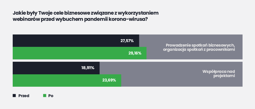 Liczby te różnią się w zależności od branży i lokalizacji. Nastąpił jednak niezaprzeczalny wzrost w zakresie pracy zdalnej i korzystania z platform wideokonferencyjnych oraz narzędzi współpracy online, które były z nimi związane. Zaznaczyliśmy to wyraźnie w naszym ostatnim raporcie wraz ze wzrostem użytkowania platformy ClickMeeting do spotkań biznesowych oraz współpracy przy projektach.