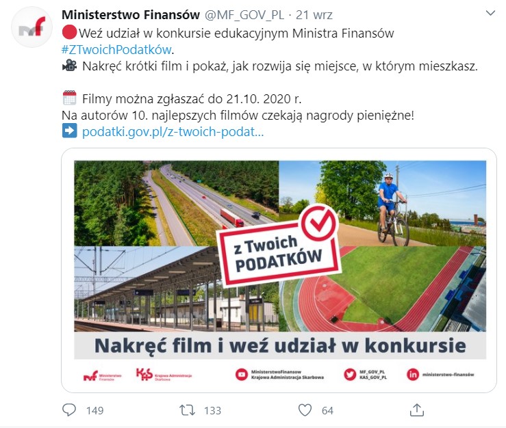 Kilka dni temu Ministerstwo Finansów opublikowało na swoim Twitterze informację o konkursie pod hasłem #ZTwoichPodatków. W jego ramach MF zachęca użytkowników, by nagrywali filmiki, w których pokazują, na co zostały wydane pieniądze z podatków w ostatnich latach. Jak bowiem czytamy na stronie akcji, jej celem jest „pokazanie, że dzięki dochodom państwa, które pochodzą z podatków płaconych przez wszystkich obywateli, finansowane są tak ważne obszary jak edukacja, ochrona zdrowia, bezpieczeństwo publiczne i wiele innych”.