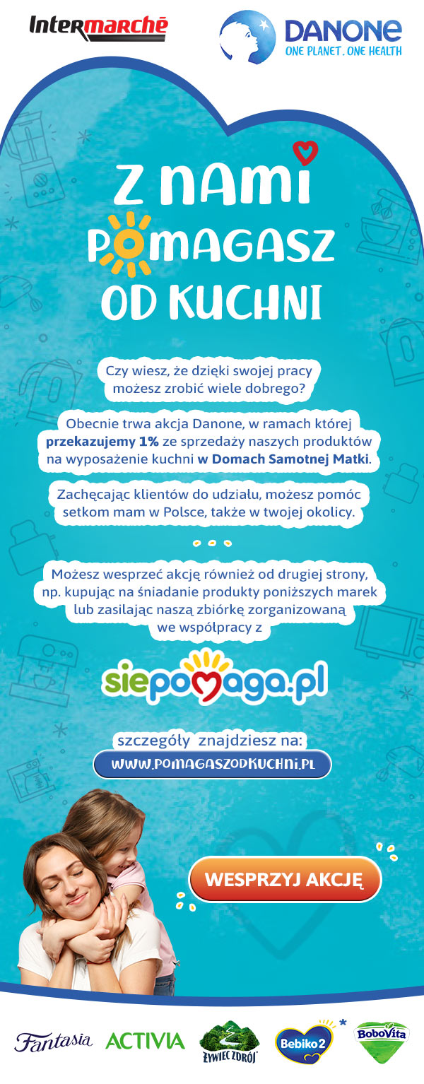 Intermarché jest jedną z sieci handlowych, które dołączyły do akcji organizowanej przez DANONE. Celem przedsięwzięcia jest wspieranie Domów Samotnej Matki w całym kraju. Inicjatywa polega na tym, że 1 proc. ze sprzedaży produktów wybranych marek zostanie przeznaczony na zakup sprzętów kuchennych do placówek zlokalizowanych w różnych miastach w Polsce. Klienci, którzy kupią promocyjne artykuły i tym samym wesprą akcję „Z nami pomagasz od kuchni”, mogą zarejestrować paragon i odebrać w prezencie jeden ze 100 plakatów.