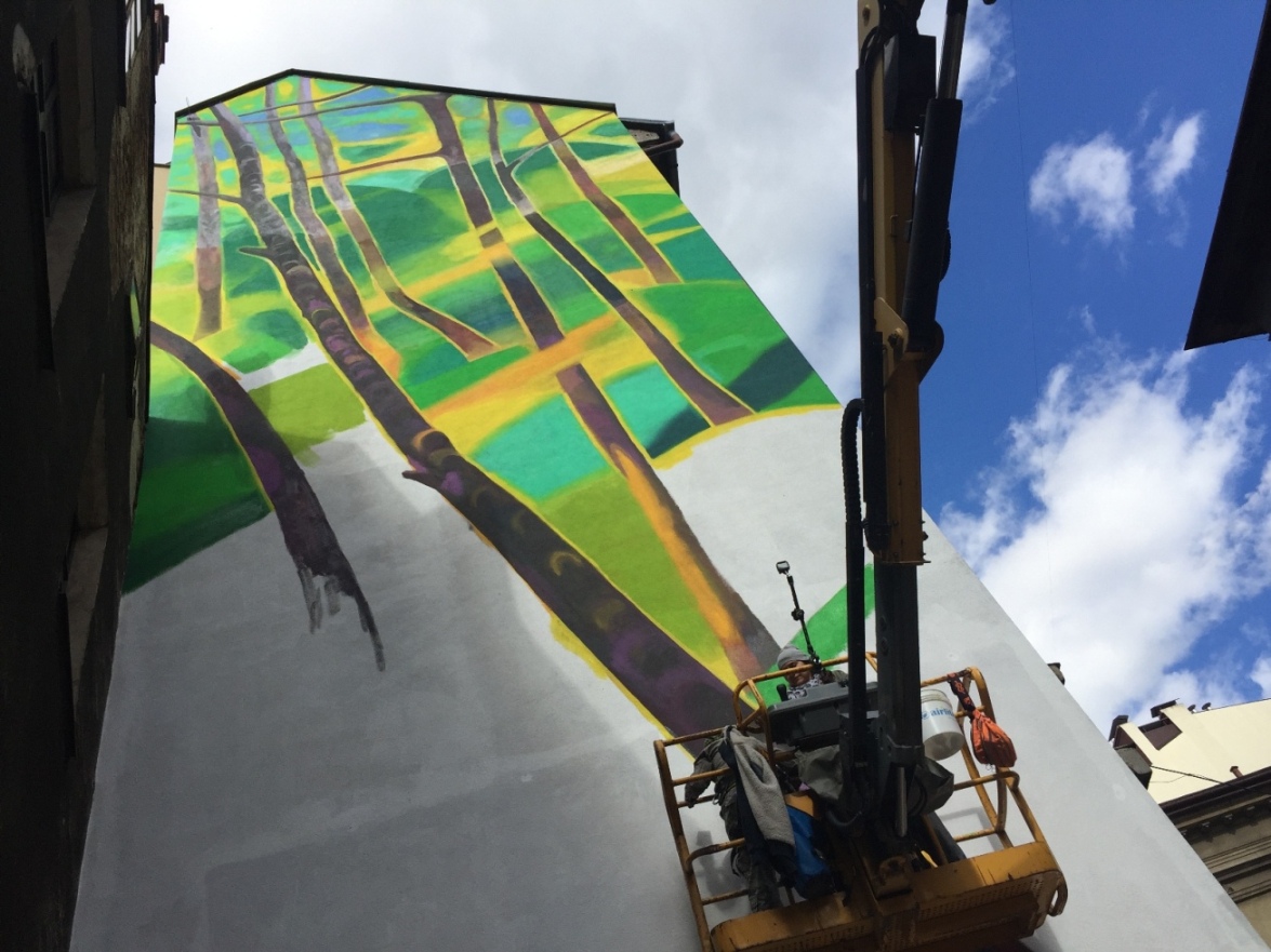 Autorką malowidła jest Ewa Ciepielewska z Grupy LUXUS. Mural przedstawia fragment lasu prześwietlonego wiosennym słońcem. Do jego wykonania użyte zostały specjalne farby antysmogowe firmy Airlite, które wykorzystują proces podobny do fotosyntezy – z tą różnicą, że w farbach obecny jest dwutlenek tytanu wytwarzający reaktywne cząsteczki, które neutralizują zanieczyszczenie powietrza w obojętne związki. Dzięki temu namalowany na muralu las zmniejszy zanieczyszczenie powietrza tak, jak zrobiłby to las o powierzchni ponad 100 m2, z kilkoma tysiącami drzew.