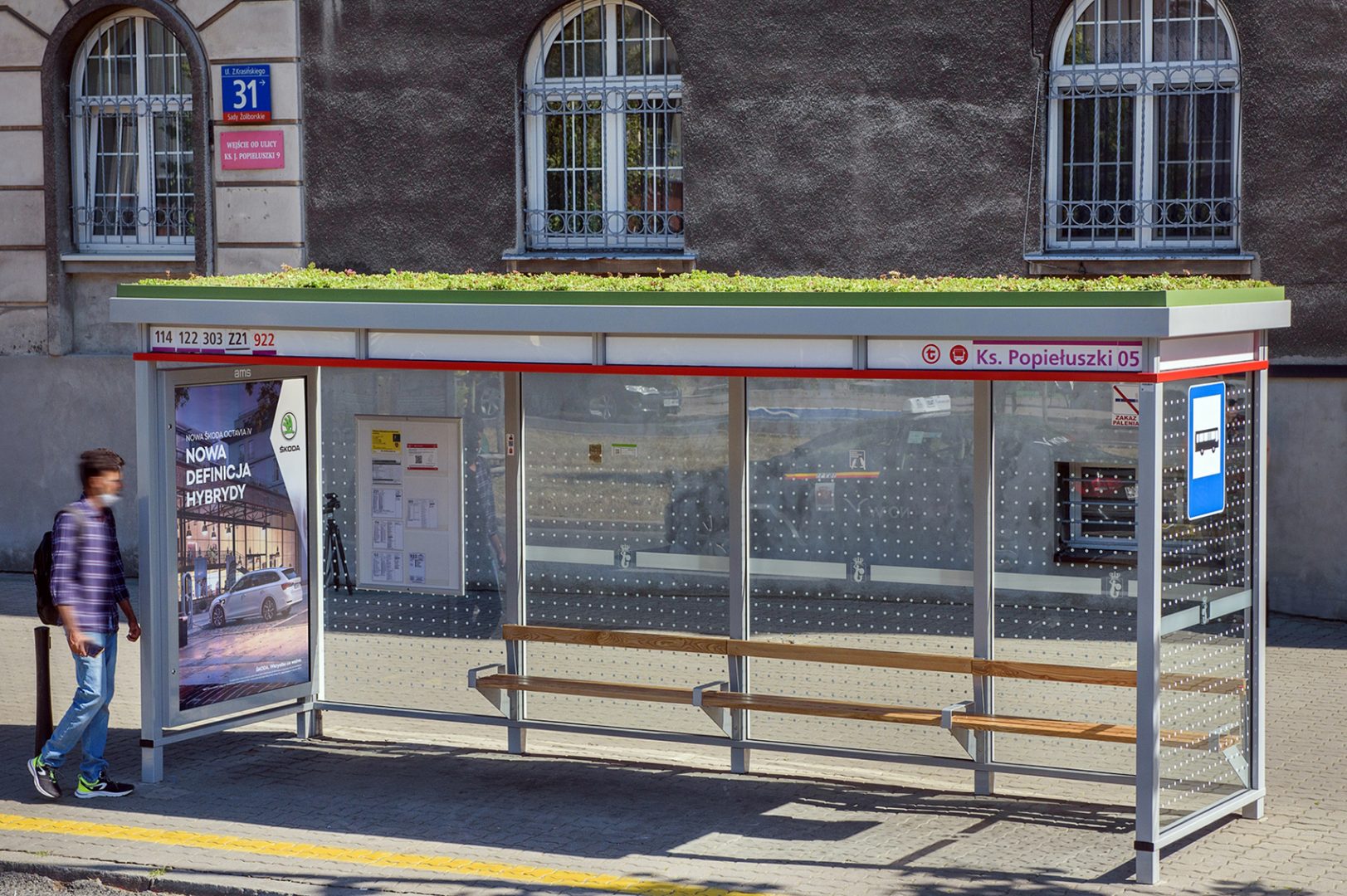 Pierwsze ekologiczne rozwiązania od AMS wprowadziliśmy na ulice w 2018 roku. Były to słupy reklamowe zasilane wyłącznie energią słoneczną. Obecnie dysponujemy największą w Polsce siecią słupów fotowoltaicznych, niewymagających zasilania zewnętrznego. Kolejnym krokiem są przyjazne środowisku wiaty przystankowe, które już w czterech miastach wyposażyliśmy w zielone dachy, a także zielone strefy na przystankach, jak ta w Krakowie, nagrodzona w konkursie Innovation.