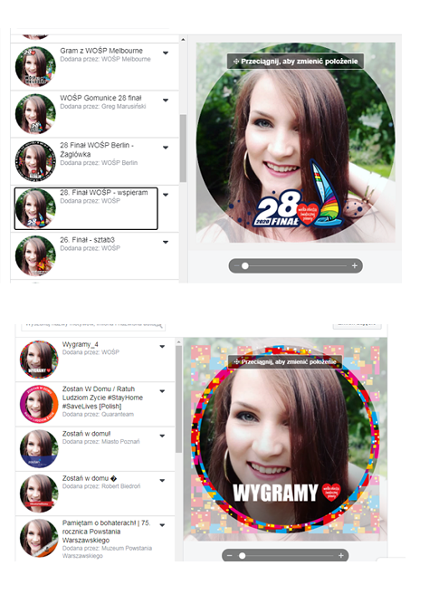 2. Fundacja Wielka Orkiestra Świątecznej Pomocy – nakładki na Facebooku „WOŚP – Wygramy”, „28. Finał WOŚP – wspieram” lub filtr na Instagramie „28. Finał WOŚP”
