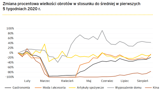 Biorąc pod uwagę poszczególne branże, z oczywistych powodów, w najmniejszym stopniu skutki zamknięcia i ograniczenia w handlu odczuła branża spożywcza, choć część sprzedaży przeniosła się z super- i hipermarketów zlokalizowanych w centrach handlowych do małych sklepów osiedlowych. Znaczne wzrosty po okresie zamknięcia odnotowały sklepy typu DIY i meblowe. Obroty w tej grupie – choć zwyczajowo rosnące w okresie letnim – w 2020 r. były wyjątkowo wysokie.