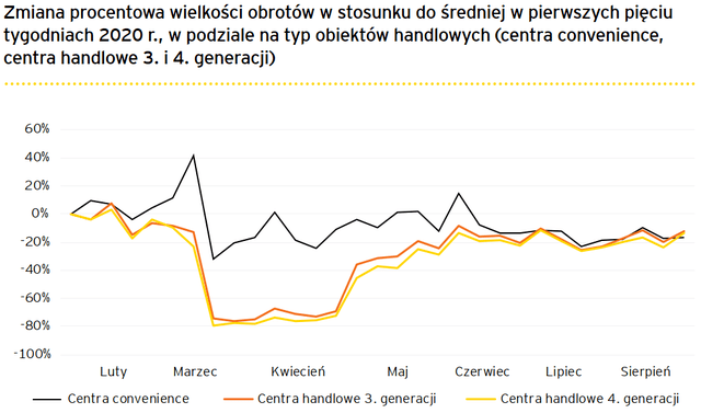 Jak wynika z analizy danych Mastercard i Top-Key przeprowadzonej przez ekspertów EY, okres lockdownu był szczególnie dotkliwy dla centrów handlowych trzeciej i czwartej generacji, w których oprócz sklepów i punktów usługowych, istotną część przestrzeni zajmują kina, restauracje, kluby fitness, czy biura. Zdecydowanie lepiej w czasie lockdownu radziły sobie obiekty typu convenience, w których za obroty w znacznej mierze odpowiadają sklepy spożywcze.