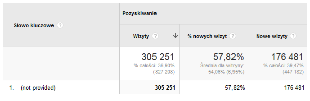 Oczywiście tyczy się to tylko słów kluczowych, inne dane jak najbardziej możemy odczytać, przykładowo liczbę wizyt, współczynnik odrzuceń (ang. bounce rate), czy – w przypadku podpiętego kodu śledzenia transakcji E-commerce – sumę przychodów z danego okresu i ilość transakcji.