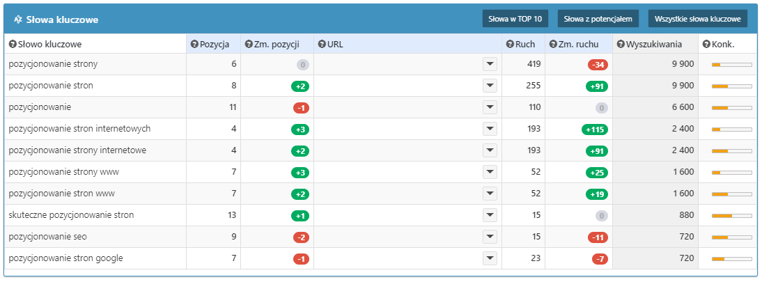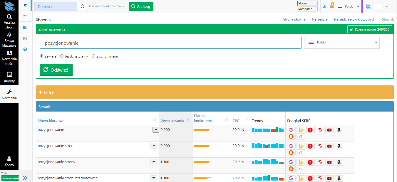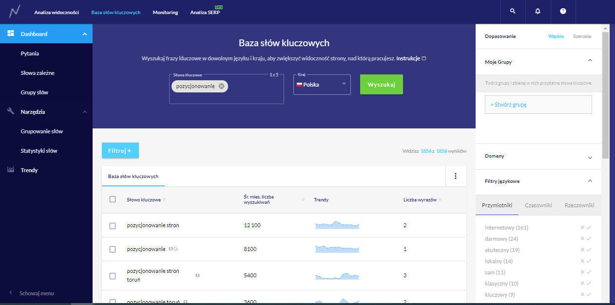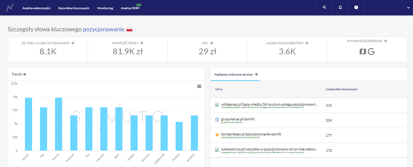 To polskie narzędzie jest dobrze znane przede wszystkim z modułu umożliwiającego analizę widoczności stron internetowych w wyszukiwarce Google. Zawiera również ogromną bazę słów kluczowych, a także może służyć do monitorowania pozycji.