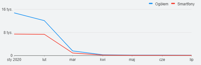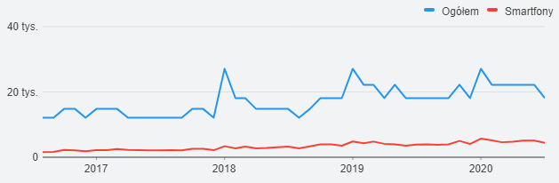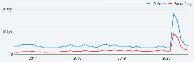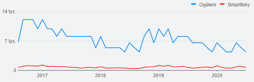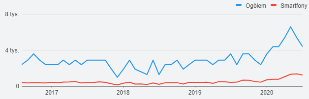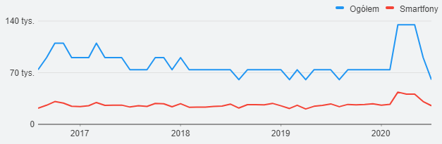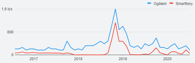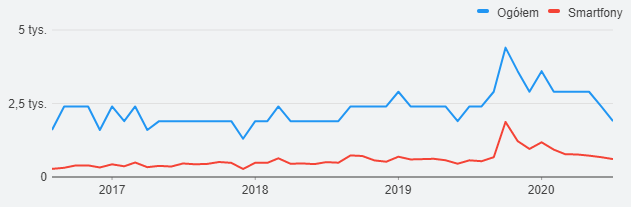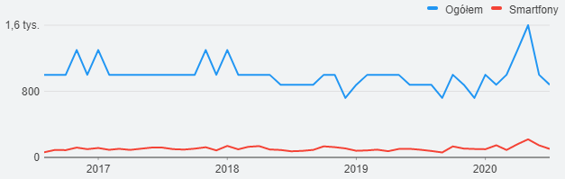 Średnia miesięczna wyszukiwalność dla przyjętego zakresu 08.2016 – 07.2020 wynosi 390, natomiast 320 w zakresie 08.2019 – 07.2020. Szczyt wyszukiwalności przypadł na listopad 2018 roku – 1 600 wyszukiwań, z tego aż 1124 wykonano na smartfonach.