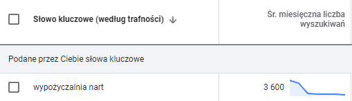 Przykładowo, hasło „wypożyczalnia nart” ma zimą znacznie większą wyszukiwalność (14 800 w styczniu 2020) niż latem (140 w lipcu 2020). Średnia miesięczna liczba wyszukiwań frazy „wypożyczalnia nart” w okresie 01.2020 – 07.2020 wynosiła 3 600.