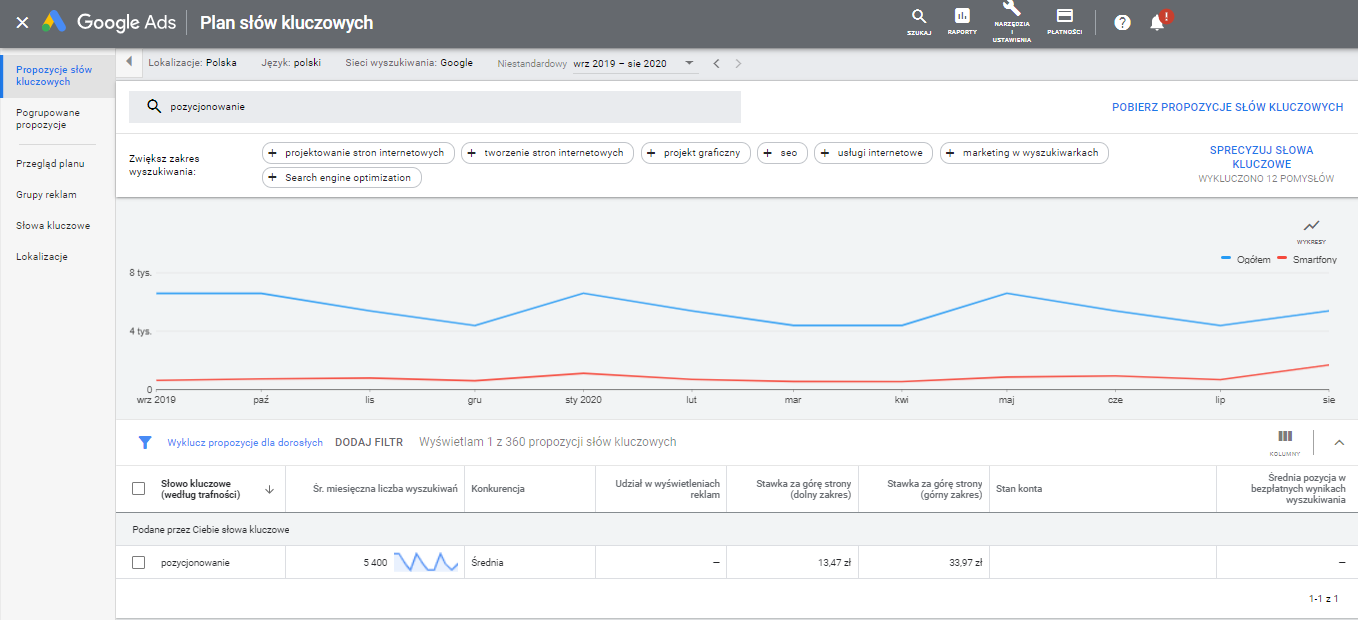 Jest to narzędzie od Google, skierowane przede wszystkim do użytkowników usługi Google Ads. Planer słów kluczowych dostępny jest w zakładce „Narzędzia i ustawienia” i umożliwia zmianę:
