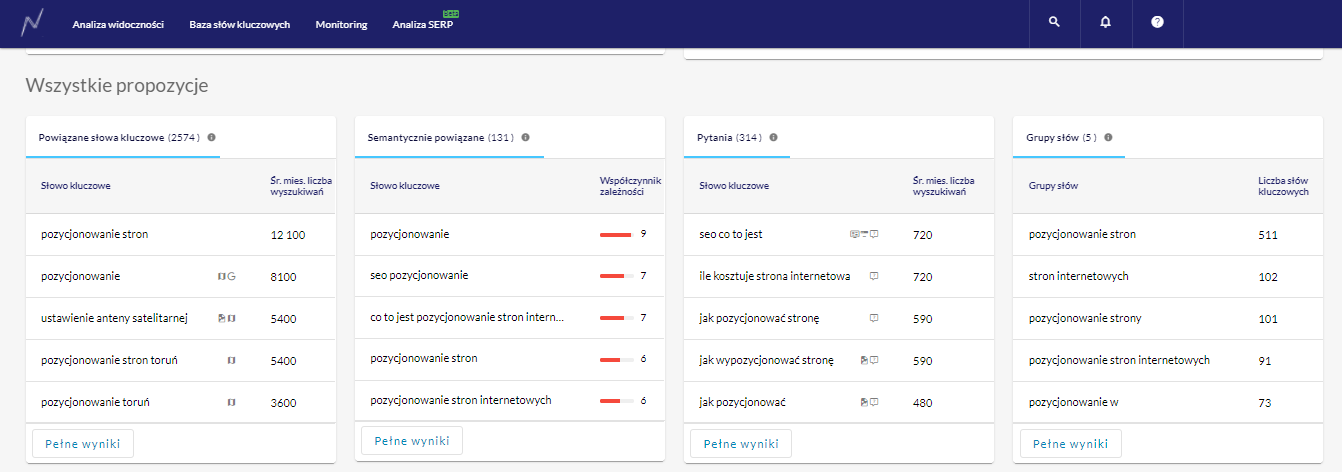 Po najechaniu kursorem na dane wyrażenie, podświetli się lupka. Gdy w nią klikniesz, przejdziesz do bardziej szczegółowych danych dotyczących słowa kluczowego, pogrupowanych propozycji zbliżonych fraz kluczowych, a także analizy SERP, czyli strony z wynikami wyszukiwania.