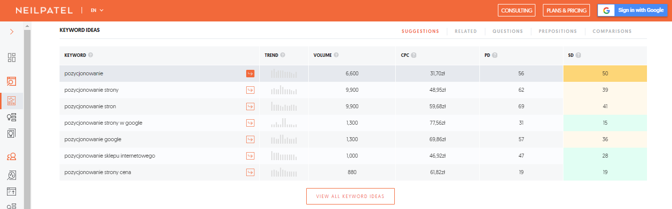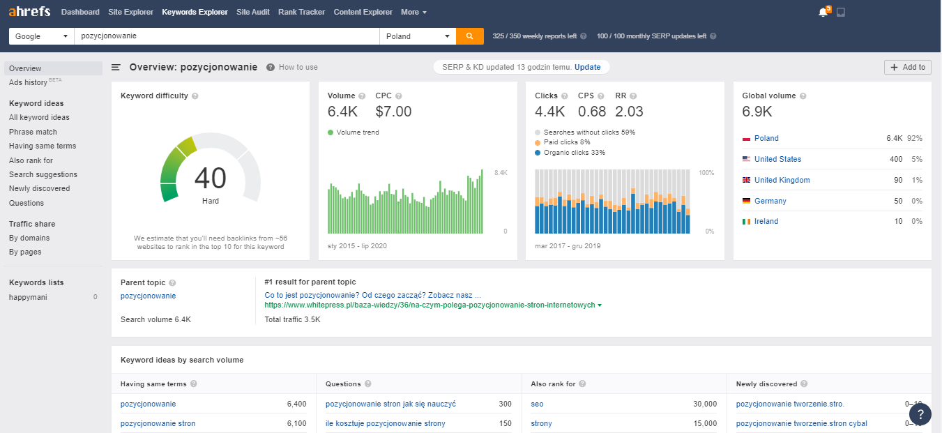 Nie tylko zbiera informacje o powiązaniach między witrynami, ale również zawiera narzędzie wykorzystywane przez specjalistów SEO do keyword researchu. Po wpisaniu interesującego Cię wyrażenia i wybraniu kraju, otrzymujesz dane między innymi na temat trudności frazy, jej wolumenu, a także trendów w minionych miesiącach i latach. Ahrefs przedstawia również propozycje fraz zbliżonych pod względem tematyki.